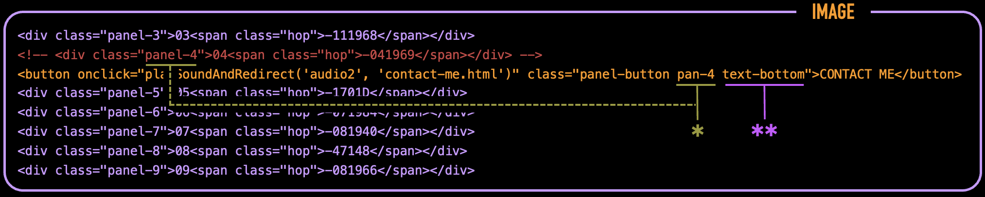 Find the div with class name panel-4 and either comment it out (as shown below) or delete it. Then replace it with the button element as shown. (Actual code that can be copied follows the graphic.) PLEASE NOTE: Panel 3 is excluded from this conversion option. Only panels 4 and above can be converted to buttons.